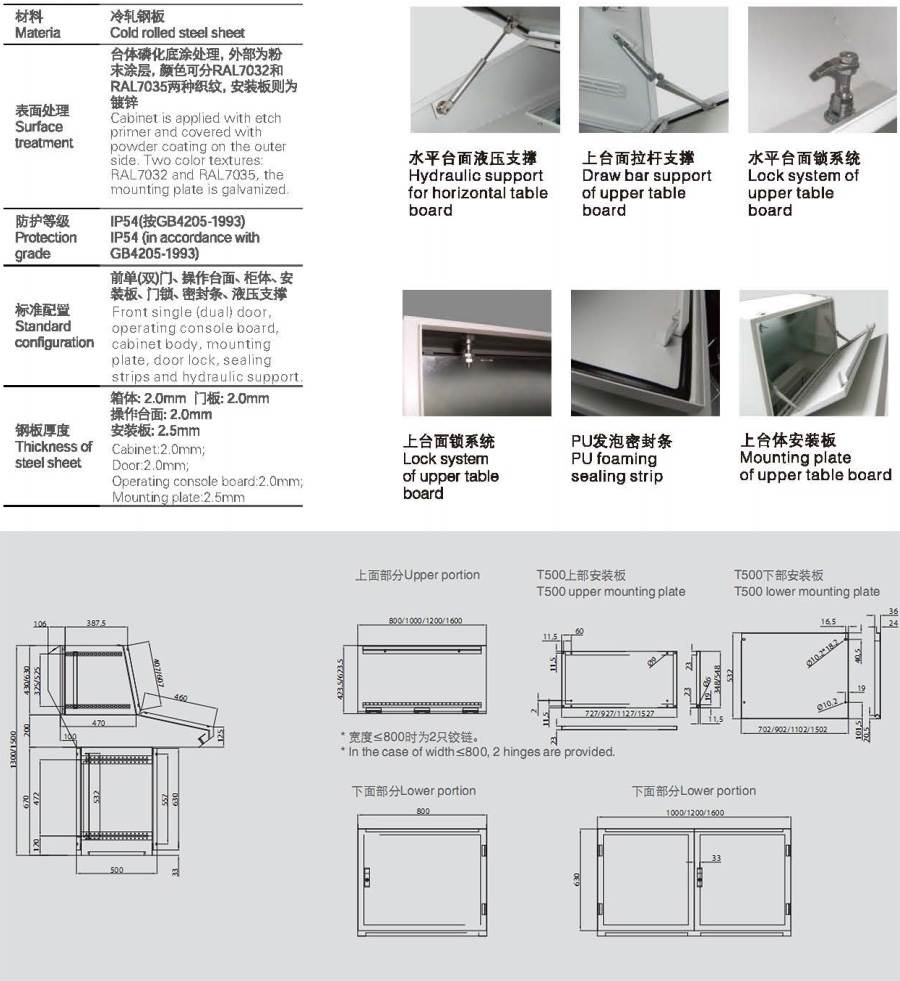 標(biāo)準(zhǔn)配置:前單(雙)門、操作臺面、柜體、安裝板、門鎖、密封條、液壓支撐